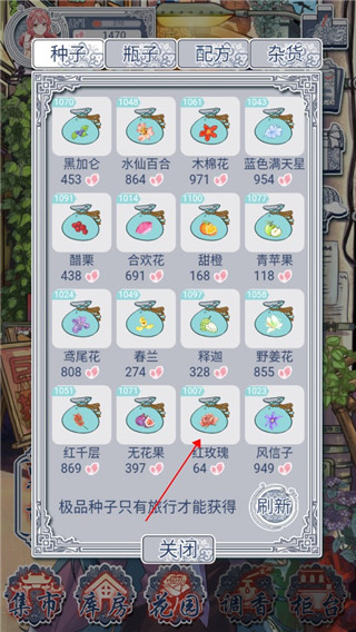 1、在游戏中首先选择【集市】,购买红玫瑰与白玫瑰的种子,要是商店中没有需要通过刷新来获得。