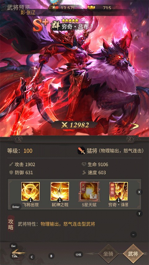 穷奇-吕布怒气增加后,可提升伤害望天-赵云反击和高频普攻,麒麟-诸葛亮为我方提供护盾和免伤,紫云-大乔可以为我方提供速度以及更多的出手次数,青丘狐-貂蝉控制敌方增益效果,并且降低敌方免伤,还可以另敌方无法追击