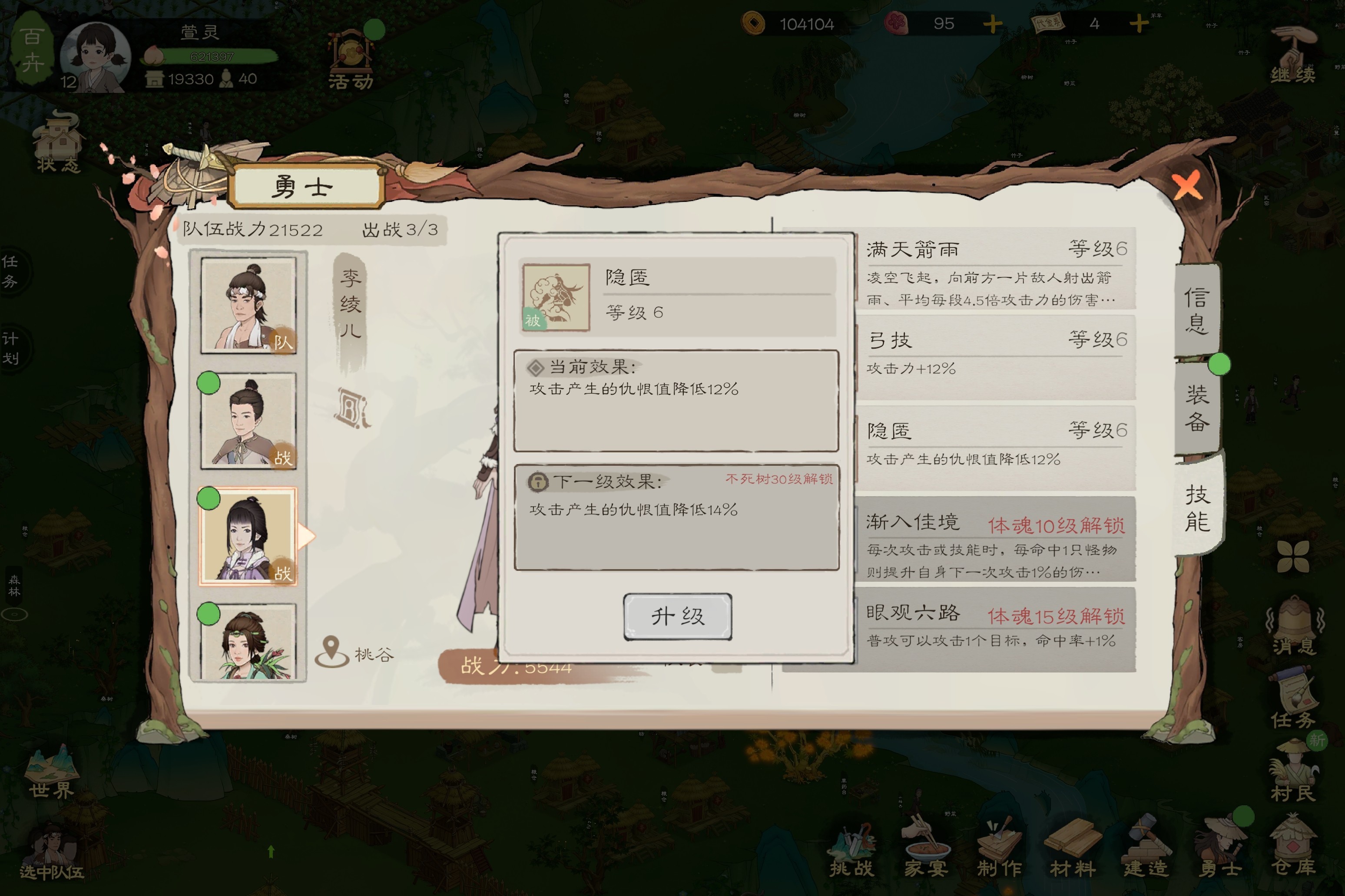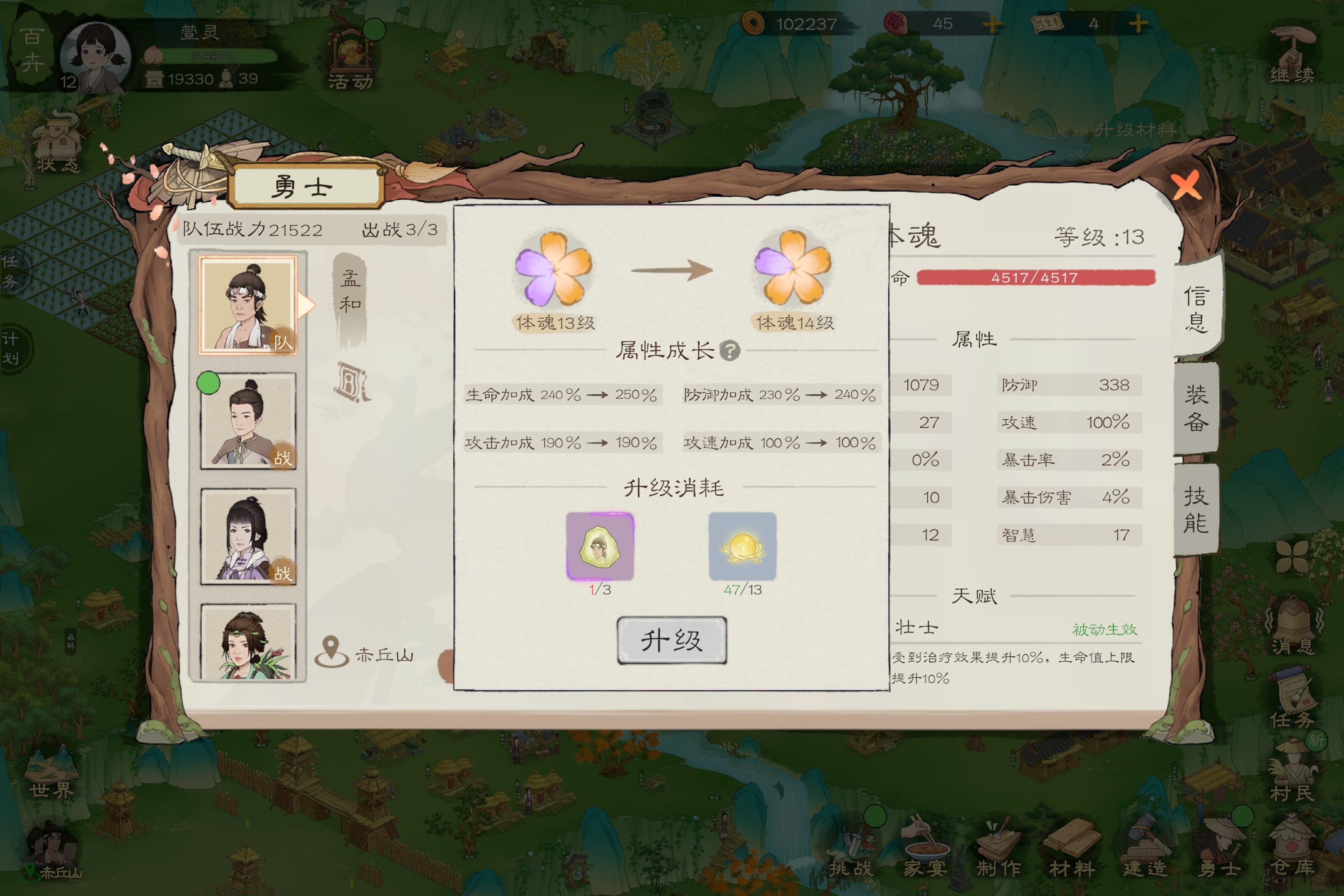 三.技能升级技能也是提升勇者实力的一大助力技能分为主动技能,天赋技能,被动技能三种主动技能:战斗中,能量充满后可自主释放的技能,技能等级可升级天赋技能:勇者自带的技能,无法升级被动技能:需要升级勇者解锁,技能等级可升级注:可通过提升不死树等级来升级勇者的主动被动技能,每提升五级不死树可升级一级勇者都主动被动技能(不死树需要每天施肥升级)