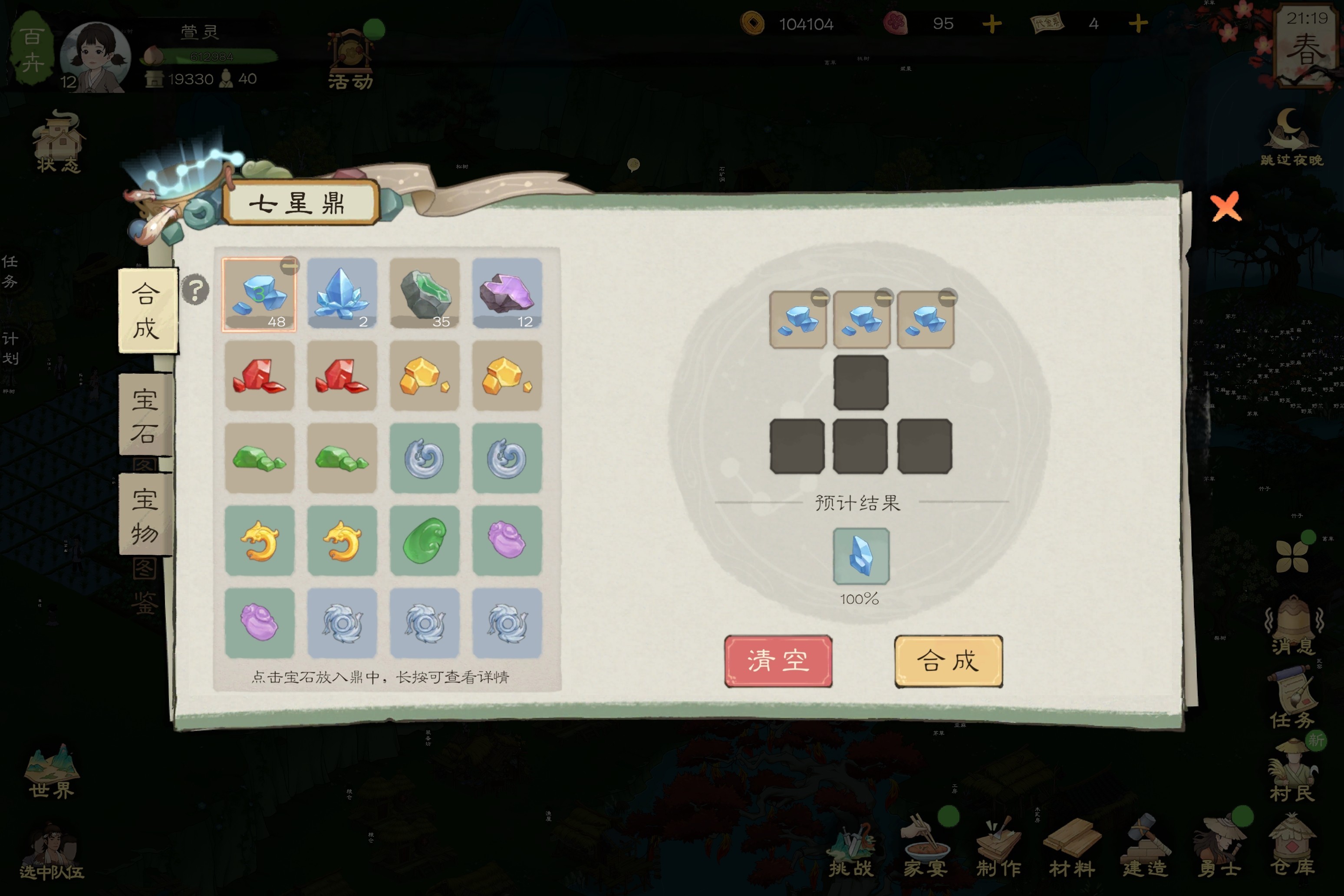 可通过点击该铁砧图标进行升级武器升级需要各种石头铁矿和各种等级的水晶衣服升级需要各种布匹和各种等级的水晶水晶获取方式1.每隔几日随机到来都兽潮,击溃后获得2.挑战中的兽潮,击溃后获得3.各村庄声望商店购买获得4.四凶兽排名获得5.食为天以及陵鱼洞活动获得水晶可通过七星鼎合成更高级的水晶