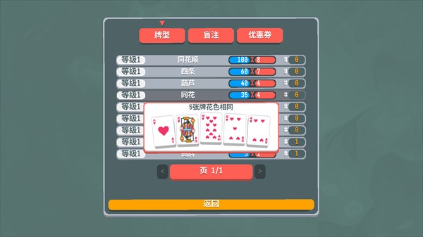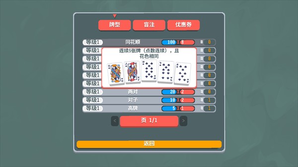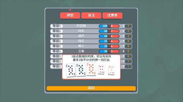 4、选好后会随机发给玩家不同的扑克牌来使用,打出各种牌型来获得分数,当分数到达关卡要求就可以通关。