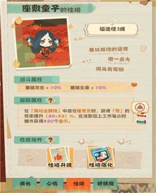 升级式神的性格需要足够的赞才可以进行升级,其中这些赞玩家可以通过将式神放入酒居屋来获得,需要一定的时间。