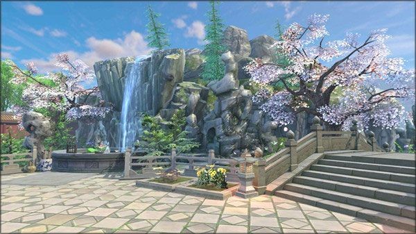 亭台楼阁,池馆水榭,映在青松翠柏之中。一座形状百态的石山坐落府邸中,清晨与日暮都沐浴着玫瑰色的霞光,瀑布从中飞洒而下,周围的古树盛开时,落花纷纷,美不胜收