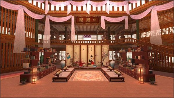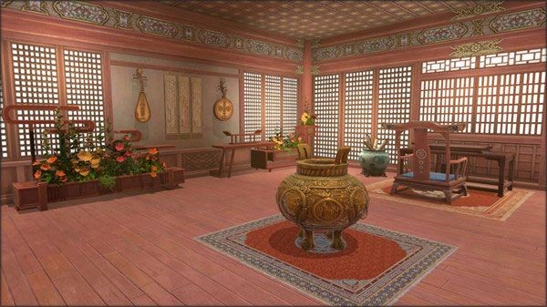 书房墙上悬挂着各处搜集的秘宝文物及古字画,殿内顶部为经典唐朝,地面铺墁红木地板,屋内摆设紫檀桌椅、华丽金鼎、青花搪瓷等。