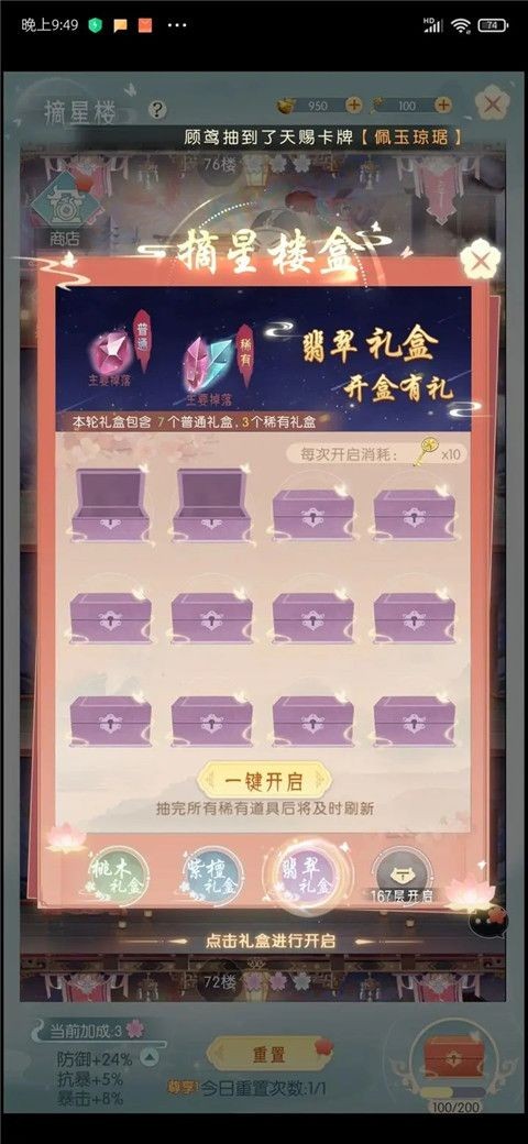 1、翡翠礼盒(紫)开启掉落:星辰结晶,星辰原石。