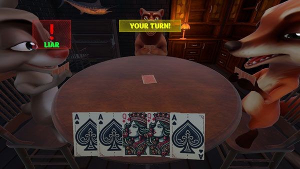 骗骗酒馆是一款策略卡牌类的游戏。为了让游戏更有代入感采用了沉浸式的第一人称视角,让玩家感觉就像真的身处其中。成功的关键在于对不同策略和技能的理解与运用。想要做到这一点,你得积累足够的经验。玩家会和狐狸、河马、猎犬这三位动物朋友一起玩一轮刺激的欺骗牌局。你需要通过撒谎和诈唬等技巧来争取最后的胜利。