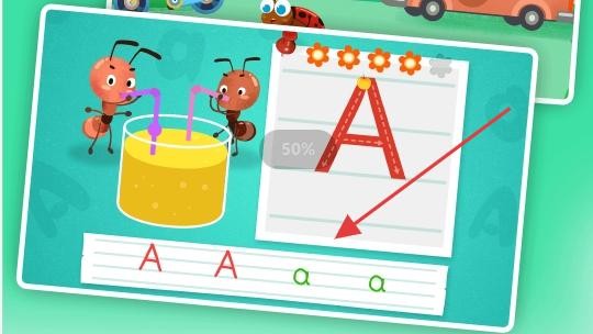 1、进入麦田英语学习界面,呈现字母学习内容,有卡通蚂蚁、果汁场景辅助,按指引书写大小写字母,跟随流程完成字母书写学习环节。