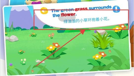 2、在英语学习页面,出现含英文句子与对应中文翻译的内容,借助绿草小花场景,跟读句子,理解语义,完成该句学习任务。