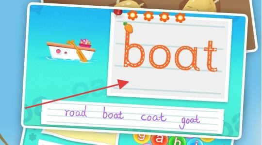 3、打开单词学习板块,显示单词boat及小船插画,下方有同类单词,认读单词,辨别发音与拼写,推进单词学习进程。