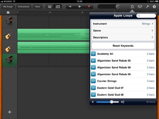 1、整体设计令人印象深刻,且完全利用了多点触摸和家用移动设备的优势。跟桌面版一样的是,它同时允许用户创建、演奏和录音,内置了多轨录音和效果器功能,以及各种各样的音色和乐器。但iPad版有桌面版所没有的Touch Insrtuments(触摸乐器),内置的虚拟键盘(如图1、2)、鼓组、吉他和合成器都可用于创造音乐和即兴音轨。