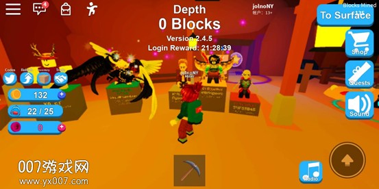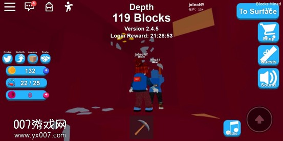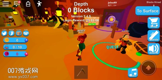 当拥有一定数量的金币后,我们可以去找标有购买标识的商人购物!进入黄色圈圈后,会弹出商店界面,共有四个分类,分别是工具、背包、装扮(可以购买一些发型、宠物等)和重生商店(可以购买一些道具)。前期主要是购买更高级的工具和背包,这样就不用频繁回到地面,提高挖矿(赚钱)的效率~拥有高级的道具后,我们就能逐渐深入更下层的地里挖矿,能挖到更好的东西,运气好的话能挖到金箱子、钻石等,但对应的,需要的挖矿工具级别会很高!