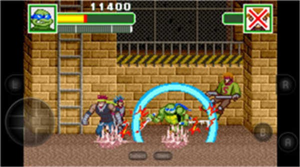 2、BOSS格郎德恰克如果你技术好的话根本不需要用大招,使用跳躲开他的三连撞,他冲到屏幕两侧硬直的时候使用普通攻击砍,待他被打掉一半血拽下管子抡你的时候,只要注意隔一段距离一直按普通攻击,就会出现他的管子怎么也抡不到你,而你每下必砍中他的奇迹(无论你用的是攻击最远的多纳泰罗还是最近的拉斐尔)。