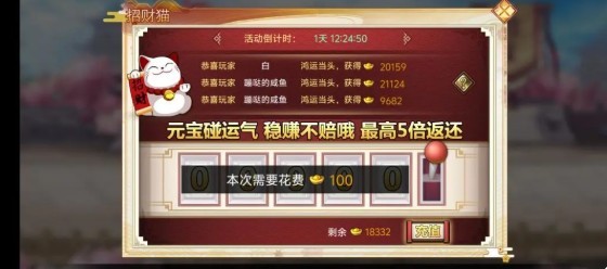①招财猫活动,每月一次,最高档位需要2.8万元宝启动。无VIP等级限制,攒够2.8万之前先不要花元宝。