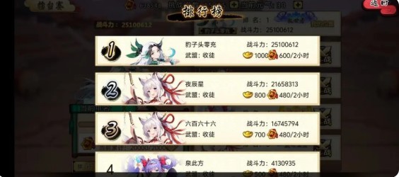 ③擂台赛每日可按排名领取元宝,可以买满次数尽量往上爬,排名越高元宝越多。有机会可以喊榜一让下位置拿个榜一称号。