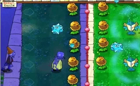 2、在左右两侧分别种植一个寒冰星星,在右侧种植一列阳光向日葵;