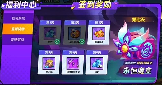 每天上线都会弹出,点击即可签到领取!其中有钻石+金币+乱斗模式中会用到的道具,以及吸引人的永恒魔盒!开出超稀有精灵的概率挺高~