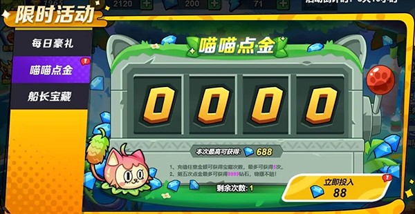 喵喵点金活动也可以赚钻石,投入88钻石,即可获得绝对高于88钻的回报,快来这里试试手气吧~