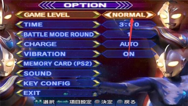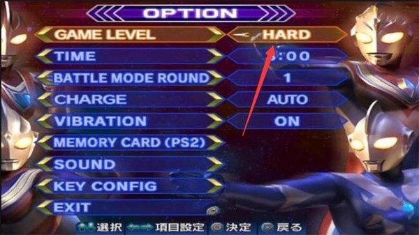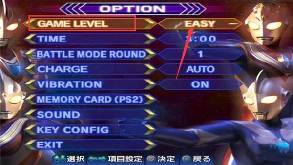 1.打开奥特曼格斗进化3后,点击去到设置界面后,看到第一项【GAME LEVEL】就是游戏级别,点击【EASY】就是简单模式