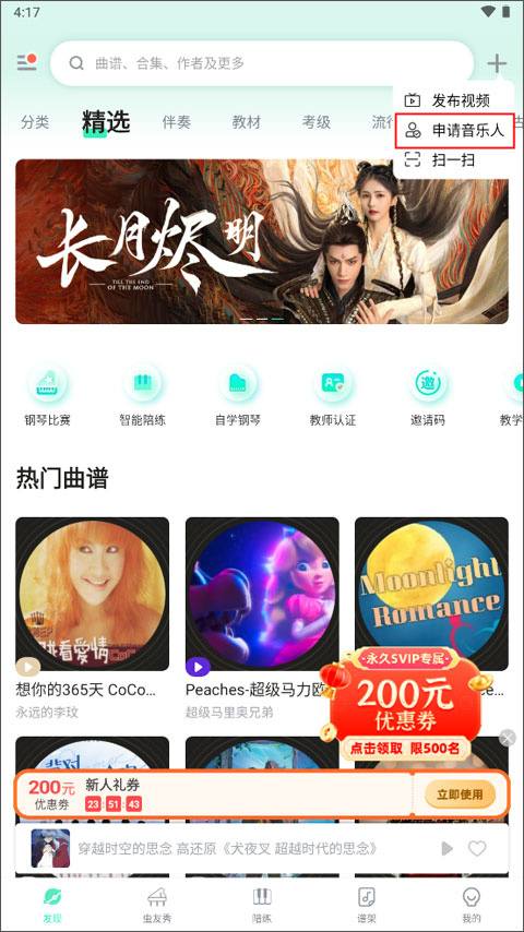 虫虫钢琴永久会员版让你快速搜索到想要的那些乐譜和内容。它自动提供各种热门歌曲的信息,让你第一时间知道当前流行哪些歌曲。当你需要联系的时候,也可以直接使用,非常方便。