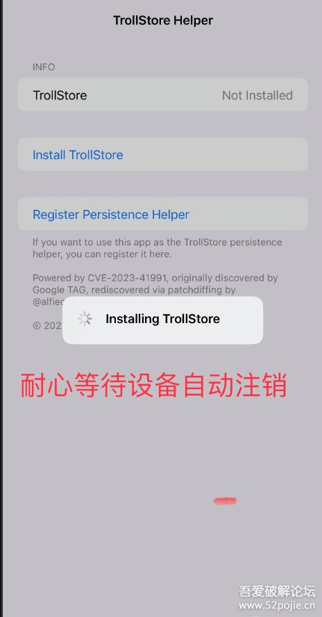 第七步:打开提示APP,点击Install TrollStore,耐心等待设备自动注销(其他不要乱动)