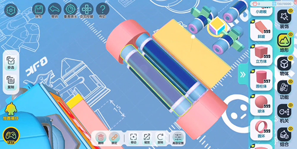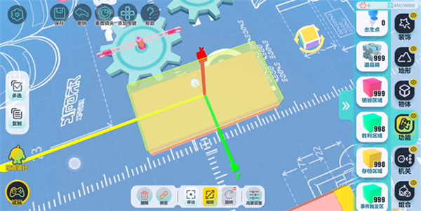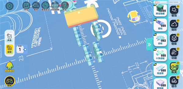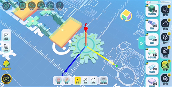 为方便操作,在正式开始搭建前,需将设置中的编辑视角更改为【上帝视角】。在机关中找到“齿轮”并拖出,即可实现“齿轮”摆放的基础操作。除了正常的摆放外,还可以点击【旋转】将“齿轮”旋转至竖起,也可以调整【缩放】调整“齿轮”大小及侧面的宽度。待尺寸设置完毕后,点击左侧【复制】按钮,即可批量复制已调整好的组件,达到节省时间、提高效率的效果。