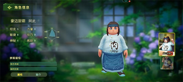 介绍:阿武是厨房与战场的双重霸主,拥有顶尖的防御能力(S级坦克)。虽不擅长技巧性操作,但高敏捷(B级)和稳如泰山的防御,让他成为团队的前排核心。