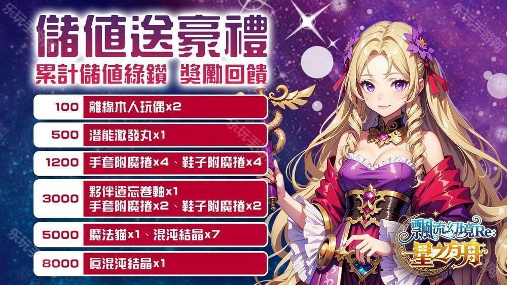 6/3(二)开服后~6/12(四)维护前,期间内累计储值「绿钻」达指定数量,即可获得「真混沌结晶」、「魔法猫」、「混沌结晶」、「伙伴遗忘卷轴」、「手套附魔卷」、「鞋子附魔卷」等虚宝道具。