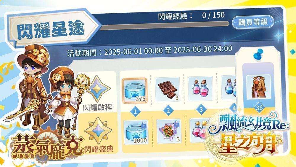 6/3(二)开服后~6/30(一)23:59 止,凡玩家角色等级达到 19 级,期间内开启活动介面将可查看每日与每周任务,达成活动指定任务后即可获得闪耀经验,随着经验累积、提升闪耀等级,「闪耀星途」中的奖励将一一解锁,包含上衣装备「蒸气庞克上衣」与特殊装备「蒸气庞克齿轮」作为本次最终大奖,正等待着完成闪耀星途的玩家亲自领取。