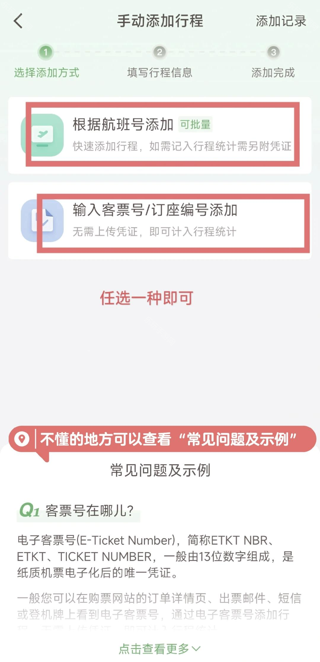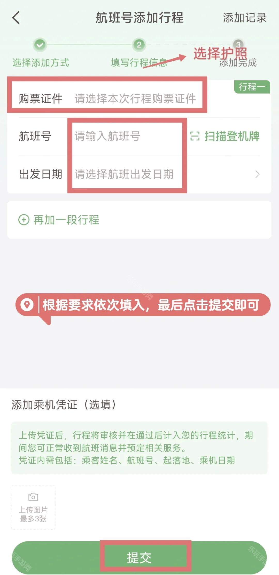 答:完成护照绑定-行程-添加航班-手动添加航班-购票证件选择护照-填写航班信息并提交