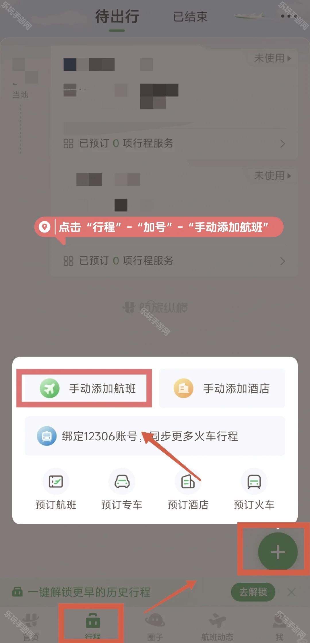 2、完成绑定后我们切换到行程页面,点击右下角的+号按钮,选择手动添加航班