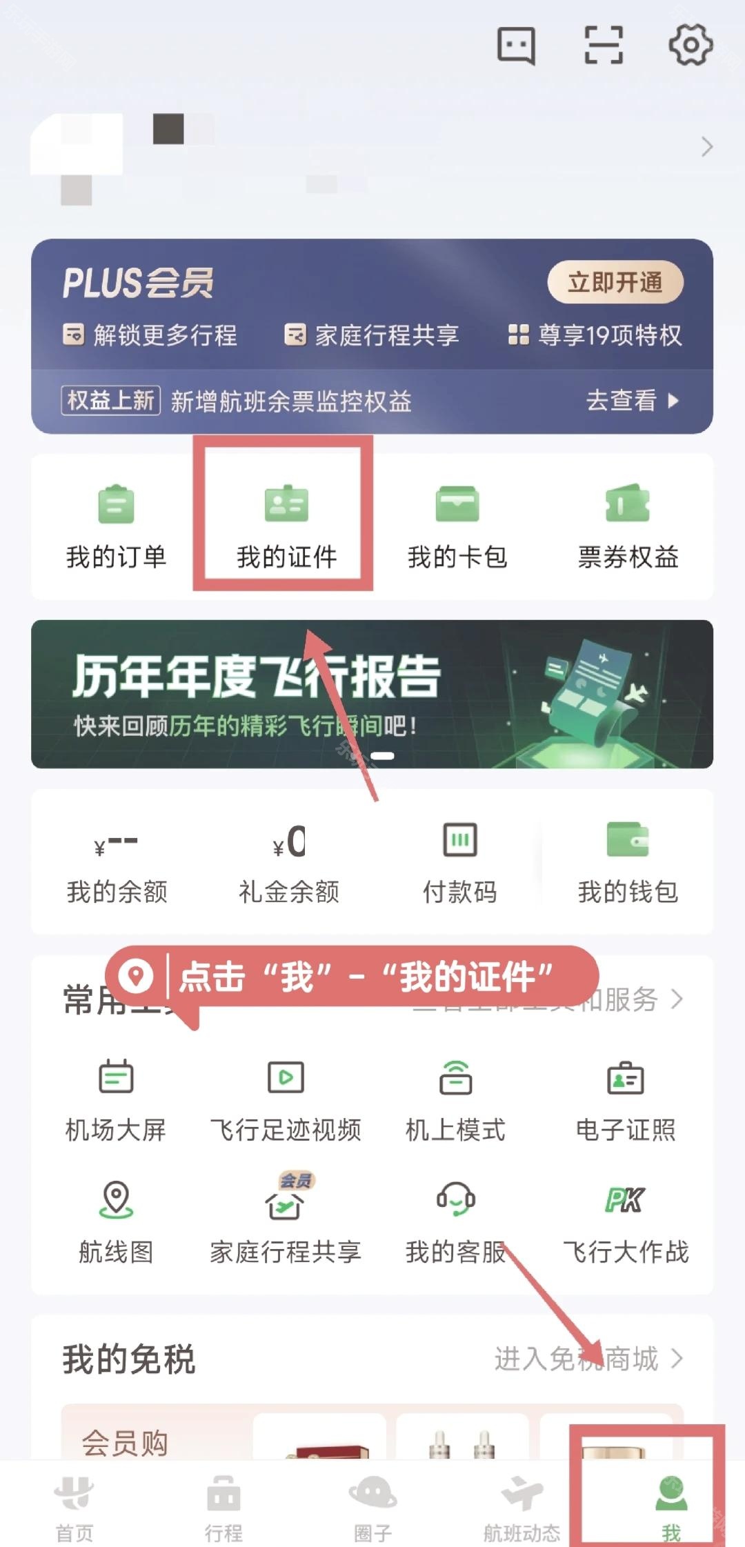 1、首先打开航旅纵横app,切换到我的页面,在顶部可以看到我的证件这个选项