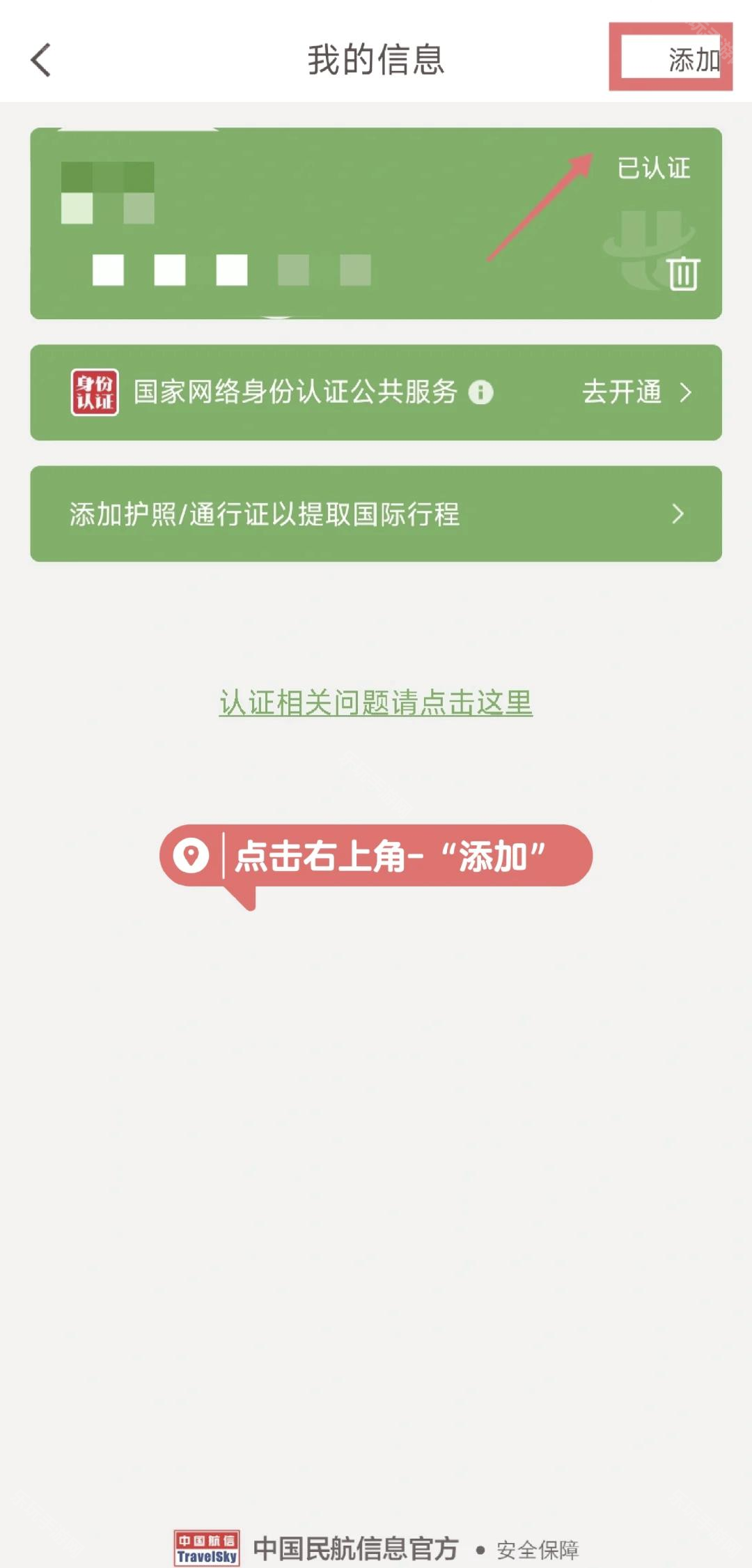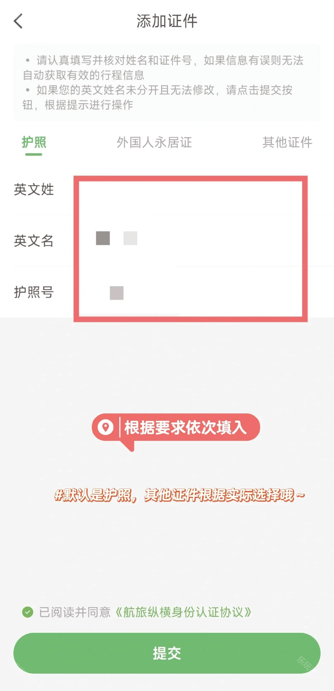 答:我-我的证件-添加-填写护照信息-提交-完成添加
