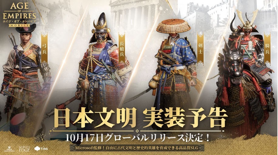Level Infinite 20 日宣布,沉浸式中世纪战争策略游戏《世纪帝国 Mobile(エイジ・オブ・エンパイア モバイル)》(iOS / Android)宣布,预计将在游戏上市后实装日本文明,今日公开包含织田信长、丰臣秀吉、德川家康、宫本武藏等历史英雄。