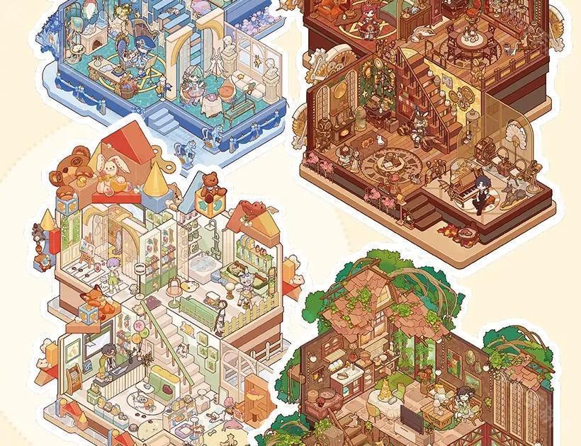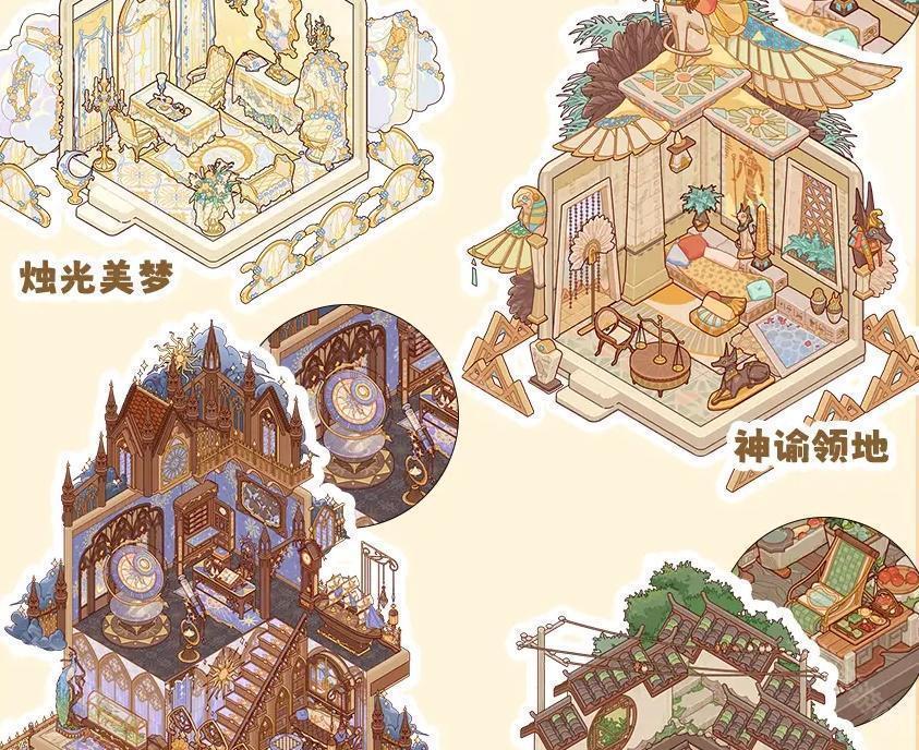 造景贴纸实体化套间:人气套间【烛光美梦】、【神谕领地】、【千奇博物馆】、【静观雅舍】以及即将公布的神秘SP套间