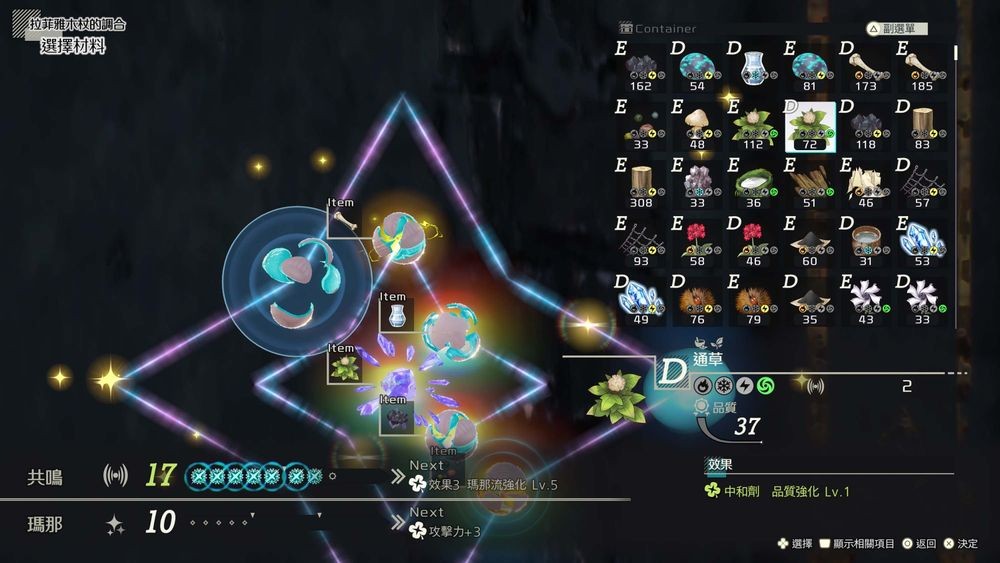 「共鸣调合」是在配方中存在的「星盘核心」加入材料,产生共鸣的调合方式。道具的强度取决于加入材料时发生的「共鸣」强度。因此,需准确选择材料,才能做出更好的道具。