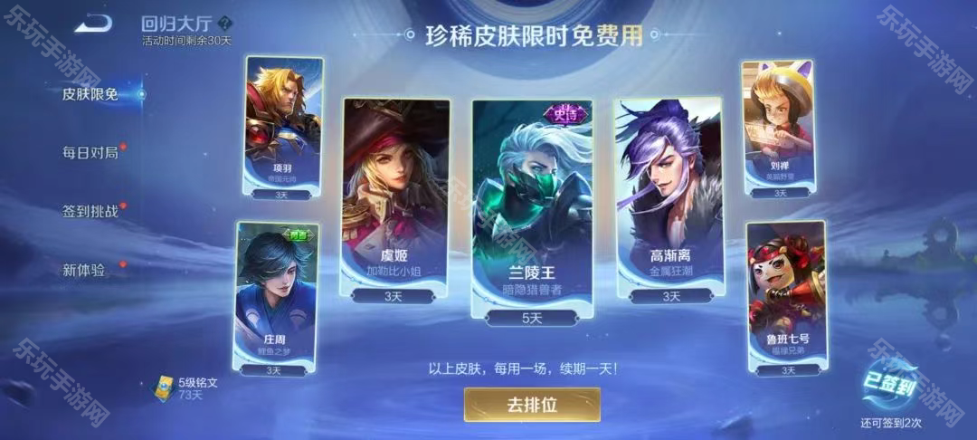 回归就能体验各种珍稀皮肤,最长可以用14天