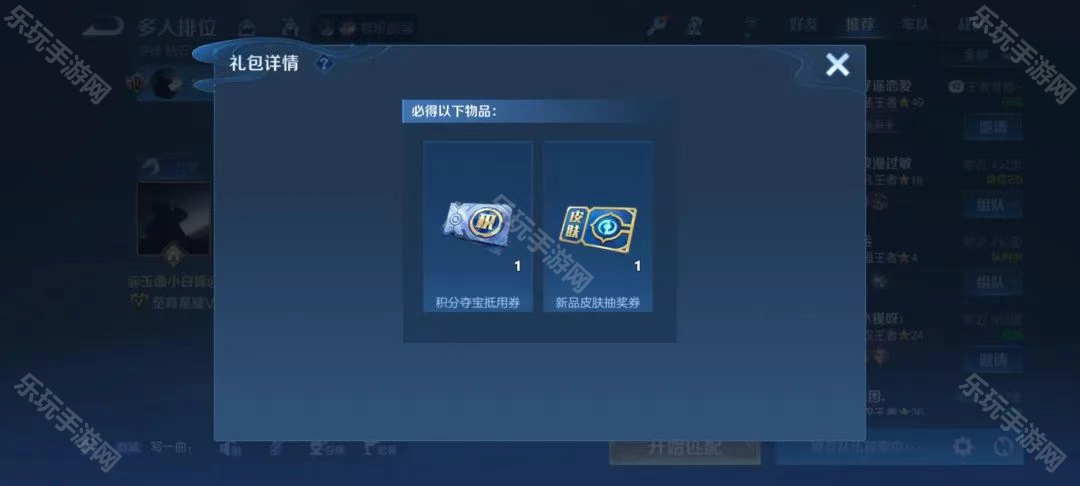 第一天开局领积分夺宝券+新品皮肤券,以及回归英雄自选礼包(可选2张新品皮肤券)(如果触发了隐藏福利,我们能在组队界面的右下角看到,一般前几天都会有)