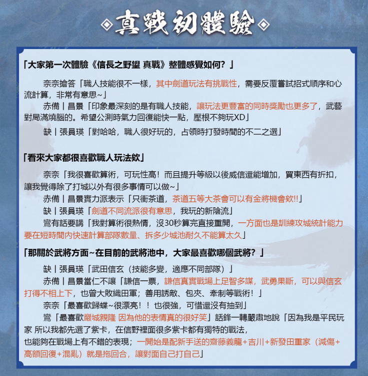 在游戏即将上线之际,官方也特别专访于封测期间便备受瞩目的活跃一门 ——「温泉乡」当主「奈奈」与三位核心成员。成员们一致表示,《信长之野望 真战》不仅高度还原史实,更营造出极强的代入感;其中的「职人」玩法更是深受喜爱,六大职人技能分别各具特色,奖励丰富且具推进性,在游戏体验中,是不可或缺的重要一环。