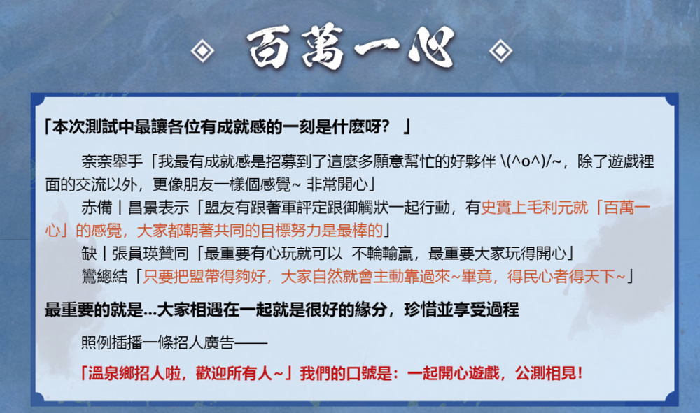 他们更认为,「成就感」是一门荣耀的致胜关键 —— 作为一款 SLG 作品,玩家能够在战国乱世中,真切体会到「百万一心」的凝聚力,才能共同御敌。唯有团结一心、得民心者,方能在乱世中汇聚众志、统霸天下,成为真正意义上的「天下人」。