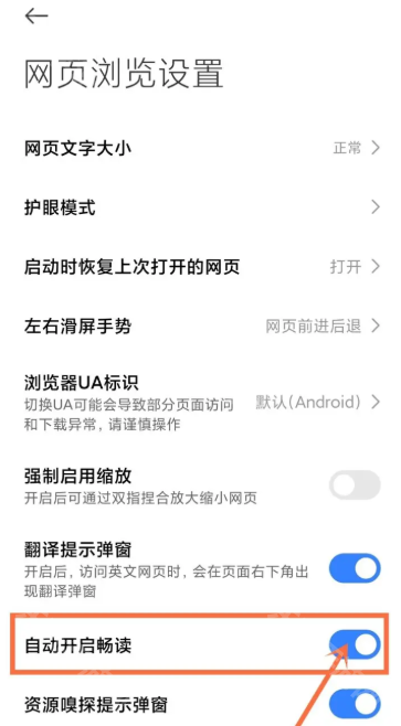 3、在底部将自动开启畅读功能开启即可