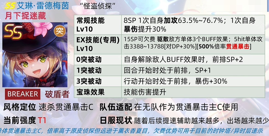 单体贯通暴击主C,倍率高于原皮但远比不上薰衣香夏目,欠费优势可用于目前的时钟塔/异时层速杀