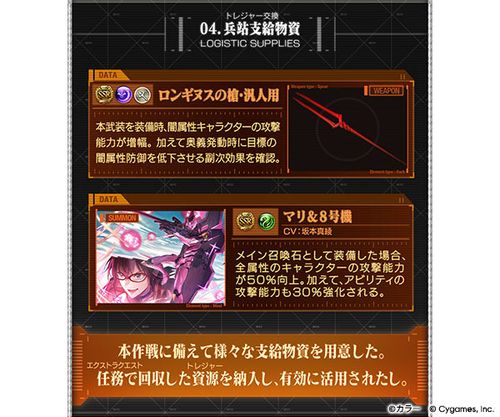 可使用在额外任务获得的宝物,获取活动限定召唤石「真理&8 号机」与活动限定武器「朗基努斯之枪・汎人用」。另外,在「额外任务」的难易度「HELL」与多人战斗获得的宝物,可用于解放活动限定武器的最终上限。
