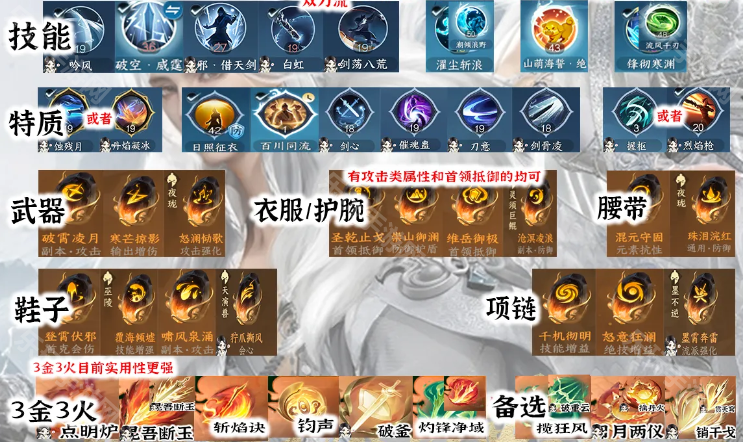 内功:选择3金3火周天,1木不必强求,内功种类尽量按下图推荐搭配,但具体需要综合词条收益,选择总进攻能力高的。