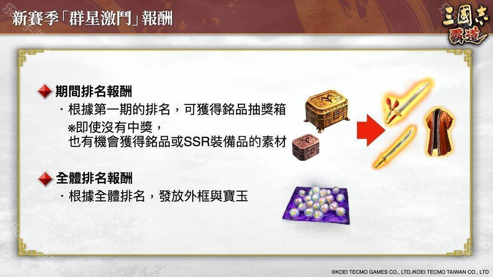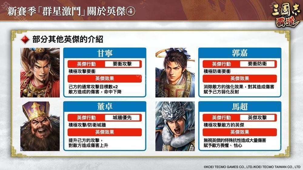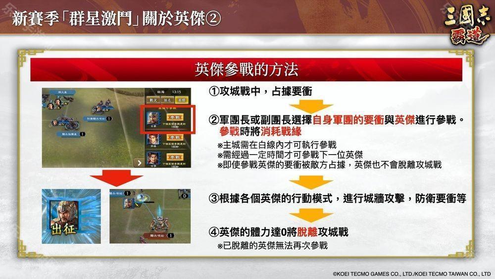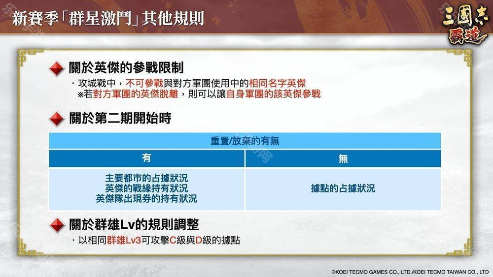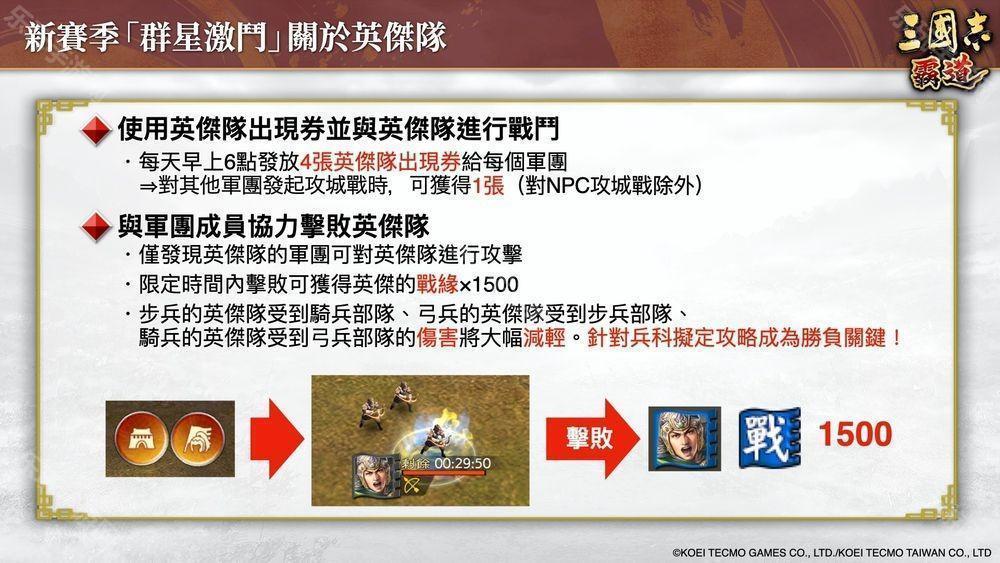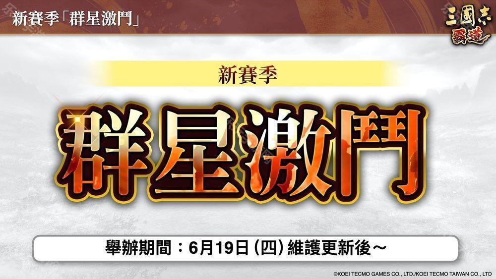 6 月 19 日(四)新赛季「群星激斗」开战。玩家可以在攻城战借助独立行动 NPC「英杰」的力量进行战斗。借助英杰的力量时需要使用「战缘」,战缘可以藉由击败地图上强力的 NPC「英杰队」获得。英杰有着各式各样的能力,第一期将有马超、郭嘉、甘宁等共 9 位英杰登场。此外,排名将以军团为单位,分为各赛季的排名和整体排名两种。各赛季排名将竞争佔领的主要都市最高阶级和排名点数。整体排名将比较随各赛季排名获得的争霸点数。
