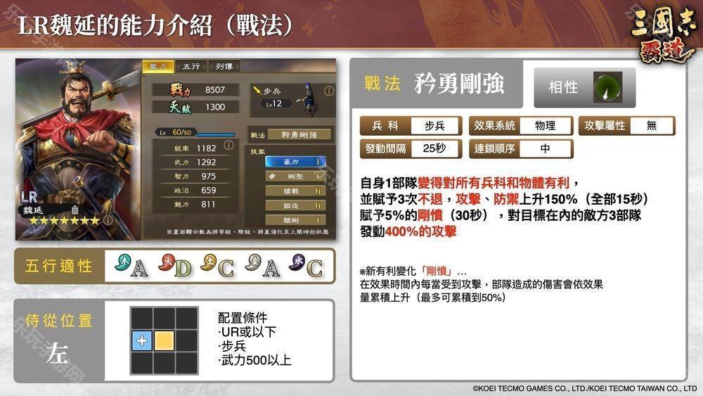「LR 魏延」是可以赋予每当受到攻击时,使造成的伤害增加的新有利变化「刚愤」。还可以藉由战法赋予有利变化「不退」,是可以抵挡敌人攻击并以强力的攻击进行反击的步兵武将。