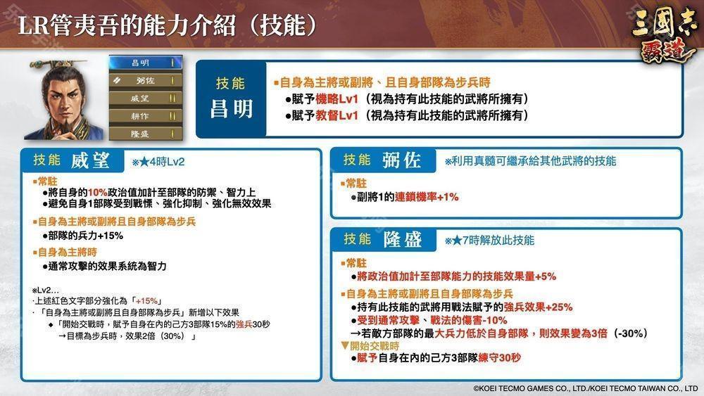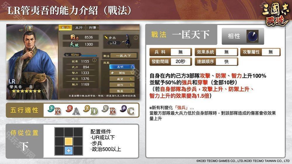 「LR 管夷吾」可以赋予自身当敌方最大兵力低于自身部队时造成伤害上升的部队提升造成伤害的新有利变化「强兵」,是可以提高最大兵力的强力步兵武将。