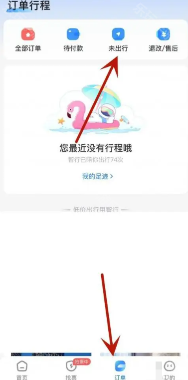 1、我们先在手机上打开智行火车票app,切换到订单页面,点击未出行