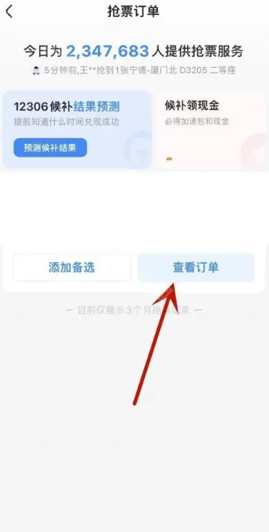 2、在抢票订单页面中可以看到正在抢票的行程,点击查看订单