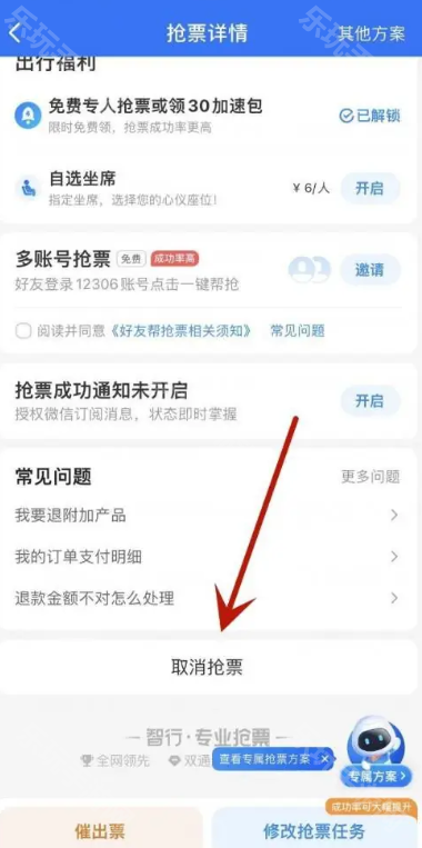 答:订单-未出行-查看订单-取消抢票
