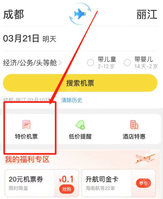 2、在订购机票的页面下我们可以找到特价机票